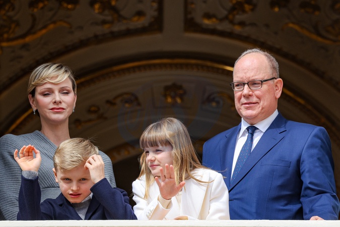 Książę Monako Albert II świętuje swoje urodziny (66 lat) z księżniczką Charlene z Monako i ich dziećmi, księciem Monako Jakubem i księżniczką Gabriellą z Monako na Place du Palais Princenier w Monako”