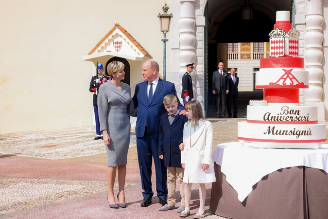 Książę Monako Albert II świętuje swoje urodziny (66 lat) z księżniczką Charlene z Monako i ich dziećmi, księciem Monako Jakubem i księżniczką Gabriellą z Monako na Place du Palais Princenier w Monako”