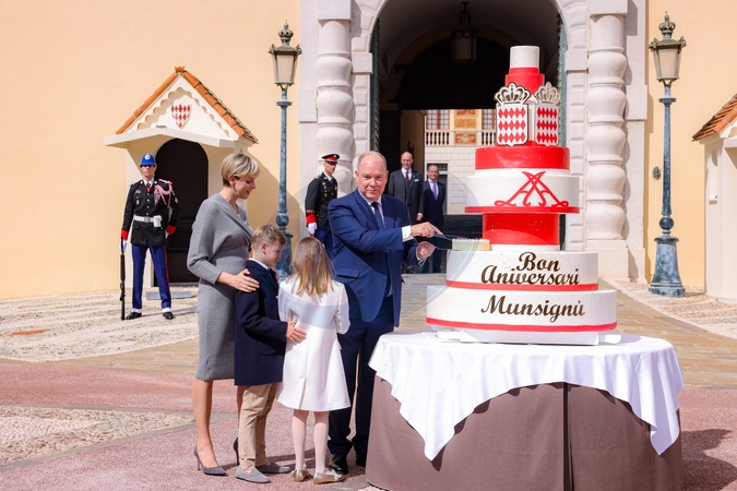 Książę Monako Albert II świętuje swoje urodziny (66 lat) z księżniczką Charlene z Monako i ich dziećmi, księciem Monako Jakubem i księżniczką Gabriellą z Monako na Place du Palais Princenier w Monako”