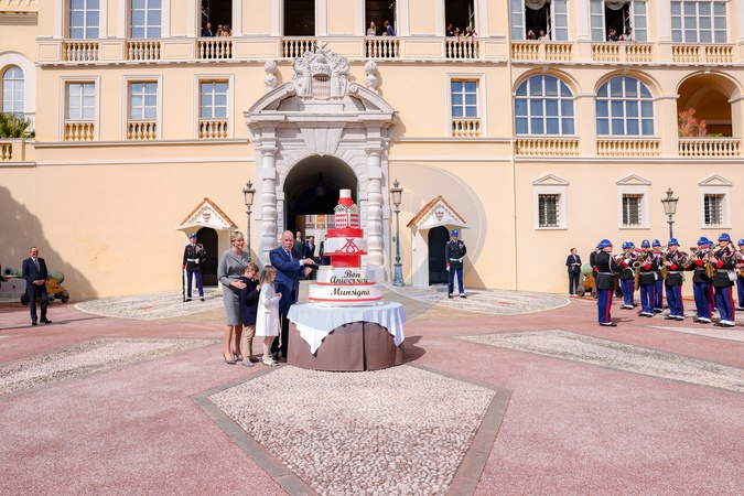 Książę Monako Albert II świętuje swoje urodziny (66 lat) z księżniczką Charlene z Monako i ich dziećmi, księciem Monako Jakubem i księżniczką Gabriellą z Monako na Place du Palais Princenier w Monako”