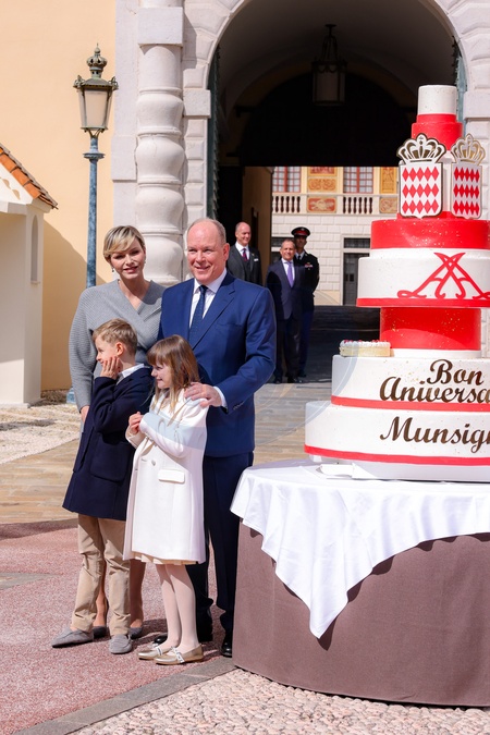 Książę Monako Albert II świętuje swoje urodziny (66 lat) z księżniczką Charlene z Monako i ich dziećmi, księciem Monako Jakubem i księżniczką Gabriellą z Monako na Place du Palais Princenier w Monako”