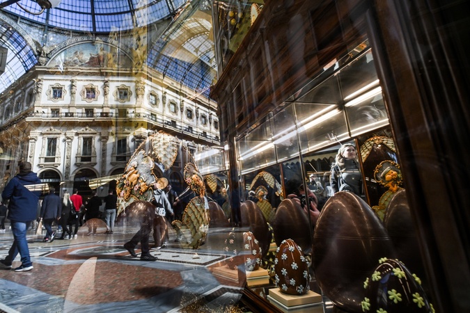 Marchesi 1824, the historic pastry shop in the Galleria Vittorio Emanuele II. Chocolate Easter eggs, finely decorated by hand, are displayed in the shop window. Milan, Italy, 12 March 2024, Credit:Nicola Marfisi/AGF / Avalon