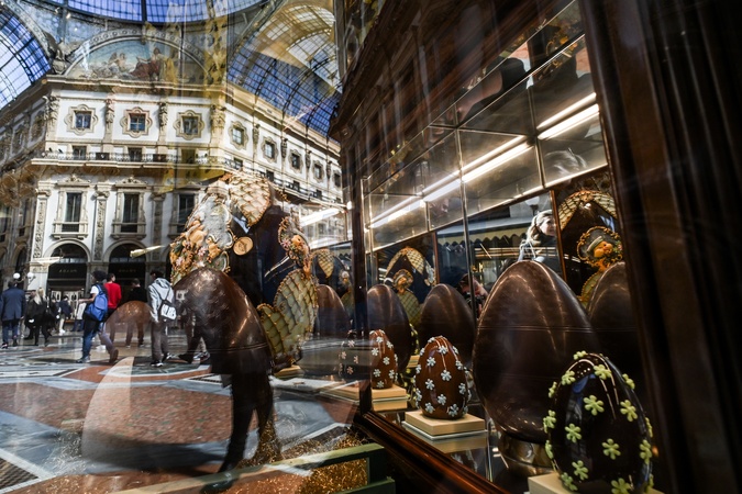 Marchesi 1824, the historic pastry shop in the Galleria Vittorio Emanuele II. Chocolate Easter eggs, finely decorated by hand, are displayed in the shop window. Milan, Italy, 12 March 2024, Credit:Nicola Marfisi/AGF / Avalon