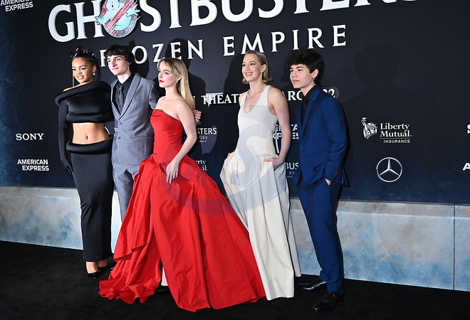 Celeste O'Connor, Finn Wolfhard, McKenna Grace, Carrie Coon and Logan Kim arrive at the NYC Premiere of "Ghostbusters: Frozen Empire" at the Loews AMC Lincoln Square in New York Ctiy on March 14, 2024, Credit:Robin Platzer / Avalon