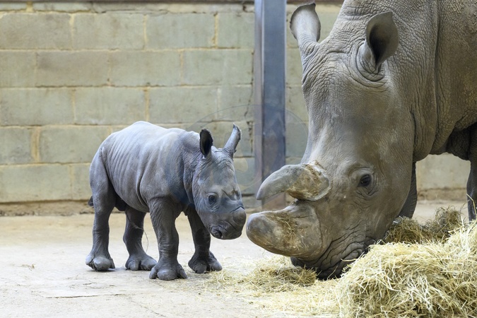 A four-day-old baby White Rhino pictured with its mother at Whipsnade Zoo, UK. P