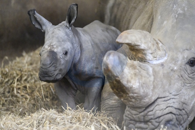 A four-day-old baby White Rhino pictured with its mother at Whipsnade Zoo, UK. Picture date: Monday March 11, 2024., Credit:Anthony Devlin / Avalon