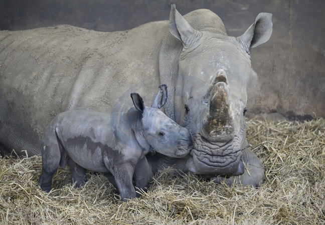 A four-day-old baby White Rhino pictured with its mother at Whipsnade Zoo, UK. P