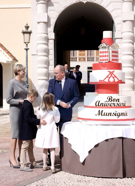 No Tabloïd - Le prince Albert II de Monaco fête son anniversaire (66 ans) avec la princesse Charlène de Monaco et leurs enfants Le prince Jacques de Monaco et la princesse Gabriella de Monaco sur la Place du Palais princier à Monaco