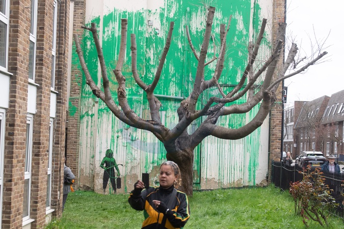A new mural by street artist Banksy has appeared next to a block of flats in Islington, London, England, UK on Monday 18 March, 2024 acting as foliage for a tree. The artwork was confirmed by the artist earlier this afternoon as he shared photos on his instagram., Credit:Justin Ng / Avalon