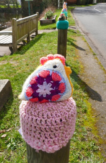 The picturesque village of St. Nicholas Hurst in Berkshire has been yarn bombed with chickens and a giant crocheted egg with an Easter bunny sitting on top to cheer up passers by., Credit:Geoffrey Swaine / Avalon