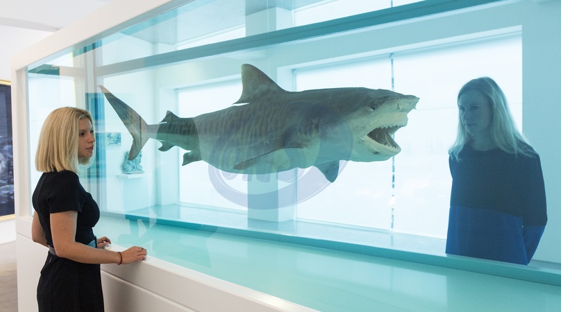 London, UK. 24/09/2015. Two Ordovas employees look at Heaven, a large shark suspended in a tank filled with a formaldehyde solution (2008-2009) by Damien Hirst. The Big Blue, on display at Ordovas in Savile Row from 25 September to 12 December 2015, is an exhibition of work inspired by the sea spanning almost two millennia., Credit:Bettina Strenske / Avalon