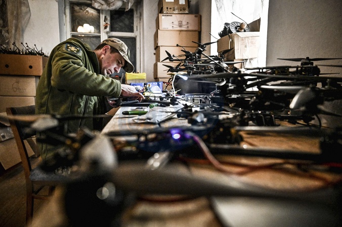 ZAPORIZHZHIA REGION, UKRAINE - MARCH 08, 2024 - A serviceman assembles a reusable bomber drone, Zaporizhzhia, south-eastern Ukraine., Credit:Dmytro Smolienko / Avalon