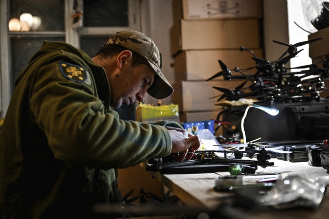 ZAPORIZHZHIA REGION, UKRAINE - MARCH 08, 2024 - A serviceman assembles a reusable bomber drone, Zaporizhzhia, south-eastern Ukraine., Credit:Dmytro Smolienko / Avalon