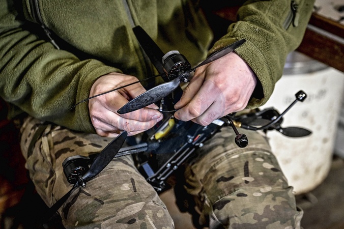 ZAPORIZHZHIA REGION, UKRAINE - MARCH 08, 2024 - A serviceman assembles a reusable bomber drone, Zaporizhzhia, south-eastern Ukraine., Credit:Dmytro Smolienko / Avalon
