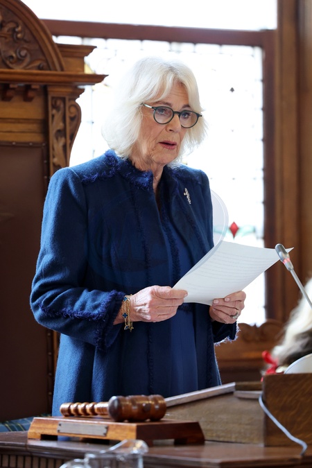 DOUGLAS, ISLE OF MAN - MARCH 20: Queen Camilla delivers a speech on behalf of His Majesty The King at Douglas Borough Council on March 20, 2024 in Douglas, Isle of Man. The Queen will be presenting the Letters Patent conferring City status on the Borough of Douglas., Credit:Chris Jackson / Avalon