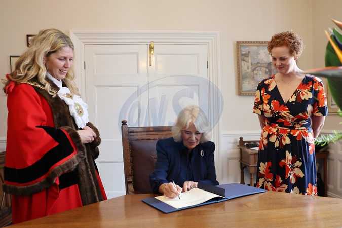 DOUGLAS, ISLE OF MAN - MARCH 20: Natalie Byron-Teare, Mayor of Douglas, Queen Camilla and Claire Wells, Leader of Douglas Council at Douglas Borough Council on March 20, 2024 in Douglas, Isle of Man. The Queen will deliver a speech on behalf of His Majesty The King before presenting the Letters Patent conferring City status on the Borough of Douglas., Credit:Chris Jackson / Avalon