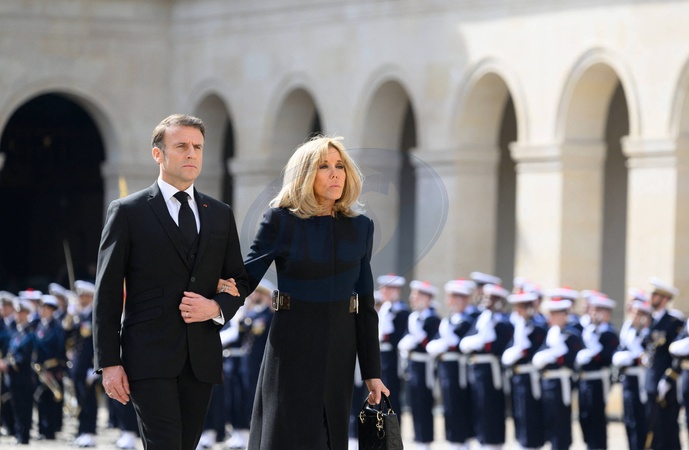 Emmanuel Macron et sa femme Brigitte - Hommage national pour l'amiral Philippe de Gaulle dans la cour d'honneur de l'Hôtel National des Invalides à Paris. Le 20 mars 2024. © Jacques Witt / Pool / Bestimage Members of the French Navy (Marine Nationale) carry the coffin during a "national tribute" ceremony to late French politician and admiral, Philippe de Gaulle, the son of Charles de Gaulle, with his portrait displayed on a facade, at the Hotel des Invalides in Paris on March 20th 2024