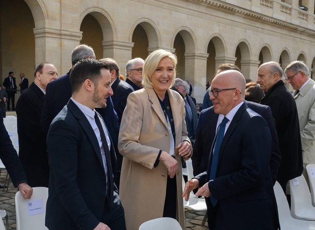Guest, Marine Le Pen et Eric Ciotti - Hommage national pour l'amiral Philippe de Gaulle dans la cour d'honneur de l'Hôtel National des Invalides à Paris. Le 20 mars 2024. © Jacques Witt / Pool / Bestimage Members of the French Navy (Marine Nationale) carry the coffin during a "national tribute" ceremony to late French politician and admiral, Philippe de Gaulle, the son of Charles de Gaulle, with his portrait displayed on a facade, at the Hotel des Invalides in Paris on March 20th 2024