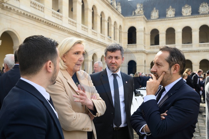 Marine Le Pen, Franck Allisio et Sebastien Chenu - Hommage national pour l'amiral Philippe de Gaulle dans la cour d'honneur de l'Hôtel National des Invalides à Paris. Le 20 mars 2024. © Jacques Witt / Pool / Bestimage Members of the French Navy (Marine Nationale) carry the coffin during a "national tribute" ceremony to late French politician and admiral, Philippe de Gaulle, the son of Charles de Gaulle, with his portrait displayed on a facade, at the Hotel des Invalides in Paris on March 20th 2024