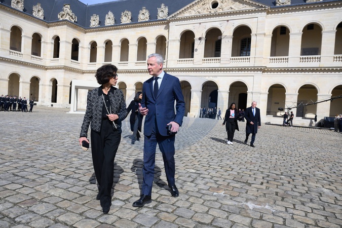 Rachida Dati et Bruno Le Maire - Hommage national pour l'amiral Philippe de Gaulle dans la cour d'honneur de l'Hôtel National des Invalides à Paris. Le 20 mars 2024. © Jacques Witt / Pool / Bestimage Members of the French Navy (Marine Nationale) carry the coffin during a "national tribute" ceremony to late French politician and admiral, Philippe de Gaulle, the son of Charles de Gaulle, with his portrait displayed on a facade, at the Hotel des Invalides in Paris on March 20th 2024