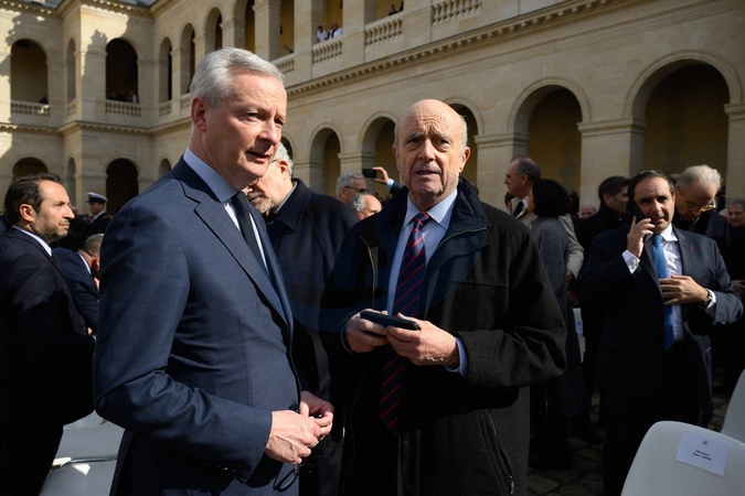 Bruno Le Maire et Alain Juppé - Hommage national pour l'amiral Philippe de Gaulle dans la cour d'honneur de l'Hôtel National des Invalides à Paris. Le 20 mars 2024. © Jacques Witt / Pool / Bestimage Members of the French Navy (Marine Nationale) carry the coffin during a "national tribute" ceremony to late French politician and admiral, Philippe de Gaulle, the son of Charles de Gaulle, with his portrait displayed on a facade, at the Hotel des Invalides in Paris on March 20th 2024