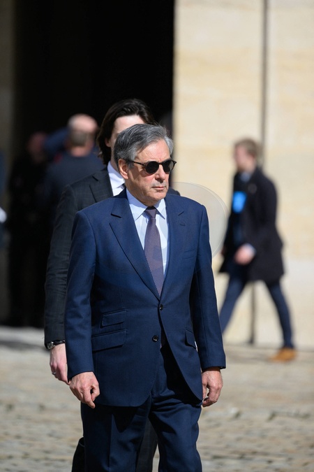Francois Fillon - Hommage national pour l'amiral Philippe de Gaulle dans la cour d'honneur de l'Hôtel National des Invalides à Paris. Le 20 mars 2024. © Jacques Witt / Pool / Bestimage Members of the French Navy (Marine Nationale) carry the coffin during a "national tribute" ceremony to late French politician and admiral, Philippe de Gaulle, the son of Charles de Gaulle, with his portrait displayed on a facade, at the Hotel des Invalides in Paris on March 20th 2024