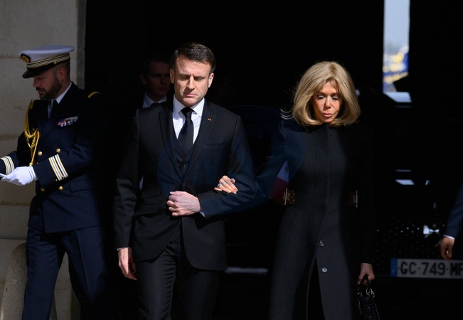 Emmanuel Macron et sa femme Brigitte - Hommage national pour l'amiral Philippe de Gaulle dans la cour d'honneur de l'Hôtel National des Invalides à Paris. Le 20 mars 2024. © Jacques Witt / Pool / Bestimage Members of the French Navy (Marine Nationale) carry the coffin during a "national tribute" ceremony to late French politician and admiral, Philippe de Gaulle, the son of Charles de Gaulle, with his portrait displayed on a facade, at the Hotel des Invalides in Paris on March 20th 2024