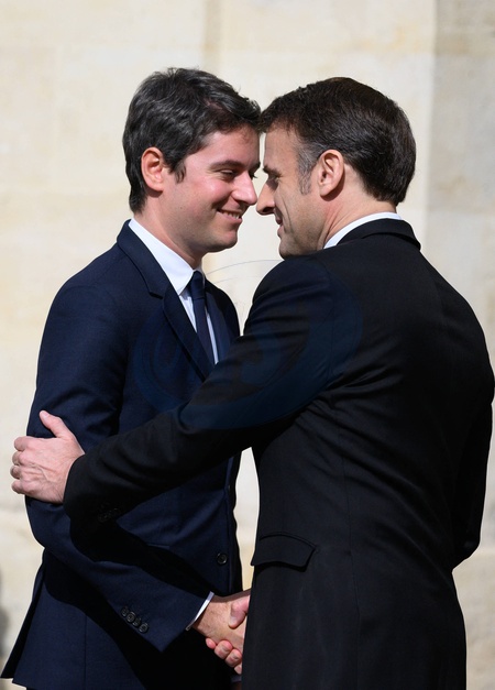 Gabriel Attal et Emmanuel Macron - Hommage national pour l'amiral Philippe de Gaulle dans la cour d'honneur de l'Hôtel National des Invalides à Paris. Le 20 mars 2024. © Jacques Witt / Pool / Bestimage Members of the French Navy (Marine Nationale) carry the coffin during a "national tribute" ceremony to late French politician and admiral, Philippe de Gaulle, the son of Charles de Gaulle, with his portrait displayed on a facade, at the Hotel des Invalides in Paris on March 20th 2024