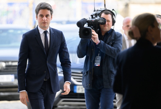 Gabriel Attal - Hommage national pour l'amiral Philippe de Gaulle dans la cour d'honneur de l'Hôtel National des Invalides à Paris. Le 20 mars 2024. © Jacques Witt / Pool / Bestimage Members of the French Navy (Marine Nationale) carry the coffin during a "national tribute" ceremony to late French politician and admiral, Philippe de Gaulle, the son of Charles de Gaulle, with his portrait displayed on a facade, at the Hotel des Invalides in Paris on March 20th 2024