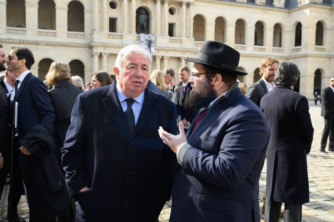 Gerard Larcher et a guest - Hommage national pour l'amiral Philippe de Gaulle dans la cour d'honneur de l'Hôtel National des Invalides à Paris. Le 20 mars 2024. © Jacques Witt / Pool / Bestimage Members of the French Navy (Marine Nationale) carry the coffin during a "national tribute" ceremony to late French politician and admiral, Philippe de Gaulle, the son of Charles de Gaulle, with his portrait displayed on a facade, at the Hotel des Invalides in Paris on March 20th 2024