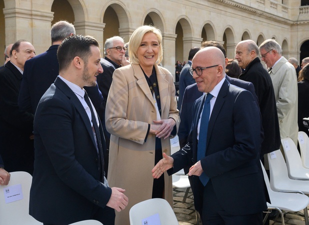 Guest, Marine Le Pen et Eric Ciotti - Hommage national pour l'amiral Philippe de Gaulle dans la cour d'honneur de l'Hôtel National des Invalides à Paris. Le 20 mars 2024. © Jacques Witt / Pool / Bestimage Members of the French Navy (Marine Nationale) carry the coffin during a "national tribute" ceremony to late French politician and admiral, Philippe de Gaulle, the son of Charles de Gaulle, with his portrait displayed on a facade, at the Hotel des Invalides in Paris on March 20th 2024