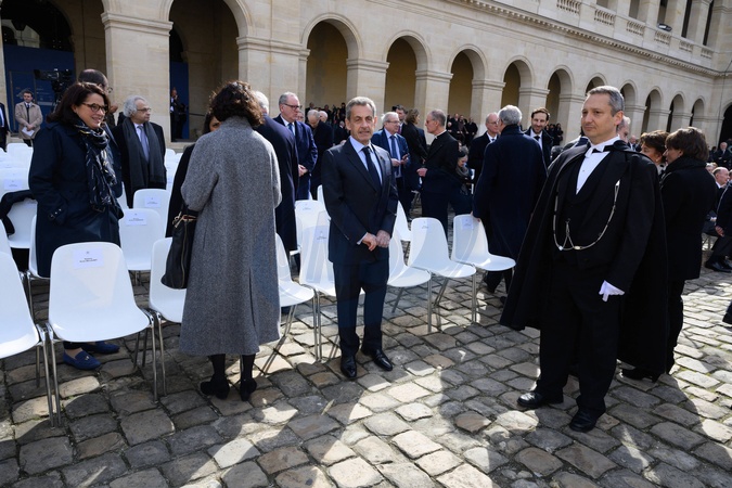 Nicolas Sarkozy - Hommage national pour l'amiral Philippe de Gaulle dans la cour d'honneur de l'Hôtel National des Invalides à Paris. Le 20 mars 2024. © Jacques Witt / Pool / Bestimage Members of the French Navy (Marine Nationale) carry the coffin during a "national tribute" ceremony to late French politician and admiral, Philippe de Gaulle, the son of Charles de Gaulle, with his portrait displayed on a facade, at the Hotel des Invalides in Paris on March 20th 2024
