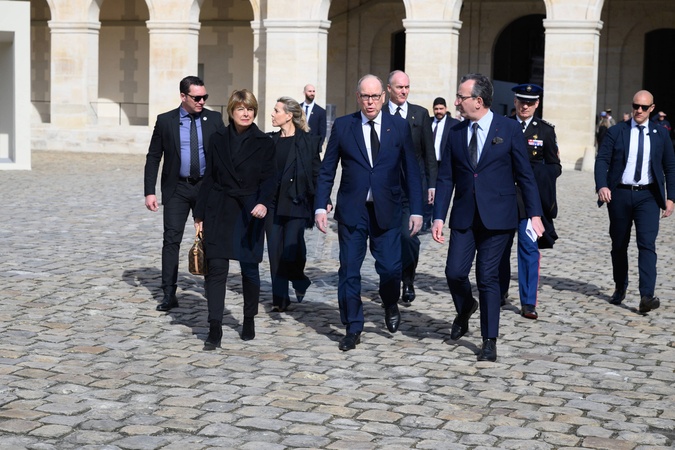Le prince Albert II de Monaco, José Pietroboni - Hommage national pour l'amiral Philippe de Gaulle dans la cour d'honneur de l'Hôtel National des Invalides à Paris. Le 20 mars 2024. © Jacques Witt / Pool / Bestimage Members of the French Navy (Marine Nationale) carry the coffin during a "national tribute" ceremony to late French politician and admiral, Philippe de Gaulle, the son of Charles de Gaulle, with his portrait displayed on a facade, at the Hotel des Invalides in Paris on March 20th 2024