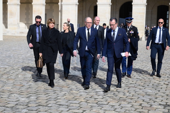 Le prince Albert II de Monaco, José Pietroboni - Hommage national pour l'amiral Philippe de Gaulle dans la cour d'honneur de l'Hôtel National des Invalides à Paris. Le 20 mars 2024. © Jacques Witt / Pool / Bestimage Members of the French Navy (Marine Nationale) carry the coffin during a "national tribute" ceremony to late French politician and admiral, Philippe de Gaulle, the son of Charles de Gaulle, with his portrait displayed on a facade, at the Hotel des Invalides in Paris on March 20th 2024