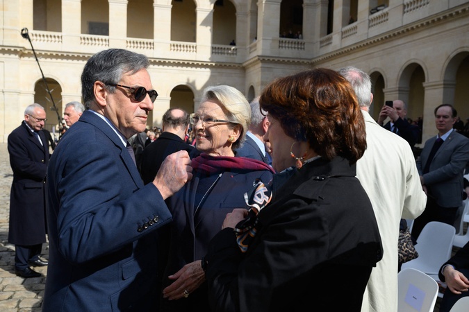 Francois Fillon, Michele Alliot Marie et Annie Genevard - Hommage national pour l'amiral Philippe de Gaulle dans la cour d'honneur de l'Hôtel National des Invalides à Paris. Le 20 mars 2024. © Jacques Witt / Pool / Bestimage Members of the French Navy (Marine Nationale) carry the coffin during a "national tribute" ceremony to late French politician and admiral, Philippe de Gaulle, the son of Charles de Gaulle, with his portrait displayed on a facade, at the Hotel des Invalides in Paris on March 20th 2024