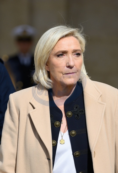 Marine Le Pen - Hommage national pour l'amiral Philippe de Gaulle dans la cour d'honneur de l'Hôtel National des Invalides à Paris. Le 20 mars 2024. © Jacques Witt / Pool / Bestimage Members of the French Navy (Marine Nationale) carry the coffin during a "national tribute" ceremony to late French politician and admiral, Philippe de Gaulle, the son of Charles de Gaulle, with his portrait displayed on a facade, at the Hotel des Invalides in Paris on March 20th 2024
