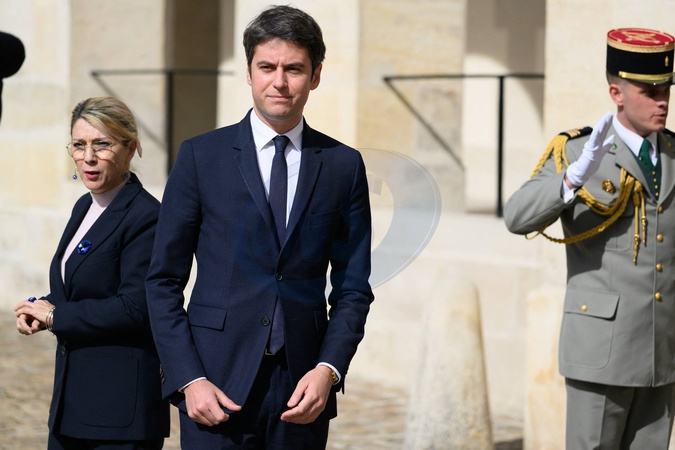 Patricia Miralles et Gabriel Attal - Hommage national pour l'amiral Philippe de Gaulle dans la cour d'honneur de l'Hôtel National des Invalides à Paris. Le 20 mars 2024. © Jacques Witt / Pool / Bestimage Members of the French Navy (Marine Nationale) carry the coffin during a "national tribute" ceremony to late French politician and admiral, Philippe de Gaulle, the son of Charles de Gaulle, with his portrait displayed on a facade, at the Hotel des Invalides in Paris on March 20th 2024