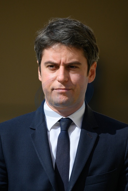 Gabriel Attal - Hommage national pour l'amiral Philippe de Gaulle dans la cour d'honneur de l'Hôtel National des Invalides à Paris. Le 20 mars 2024. © Jacques Witt / Pool / Bestimage Members of the French Navy (Marine Nationale) carry the coffin during a "national tribute" ceremony to late French politician and admiral, Philippe de Gaulle, the son of Charles de Gaulle, with his portrait displayed on a facade, at the Hotel des Invalides in Paris on March 20th 2024