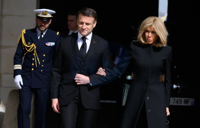 Emmanuel Macron et sa femme Brigitte - Hommage national pour l'amiral Philippe de Gaulle dans la cour d'honneur de l'Hôtel National des Invalides à Paris. Le 20 mars 2024. © Jacques Witt / Pool / Bestimage Members of the French Navy (Marine Nationale) carry the coffin during a "national tribute" ceremony to late French politician and admiral, Philippe de Gaulle, the son of Charles de Gaulle, with his portrait displayed on a facade, at the Hotel des Invalides in Paris on March 20th 2024