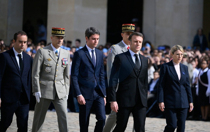 Sebastien Lecornu, Thierry Burkhard, Gabriel Attal, Emmanuel Macron et Patricia Miralles - Hommage national pour l'amiral Philippe de Gaulle dans la cour d'honneur de l'Hôtel National des Invalides à Paris. Le 20 mars 2024. © Jacques Witt / Pool / Bestimage Members of the French Navy (Marine Nationale) carry the coffin during a "national tribute" ceremony to late French politician and admiral, Philippe de Gaulle, the son of Charles de Gaulle, with his portrait displayed on a facade, at the Hotel des Invalides in Paris on March 20th 2024