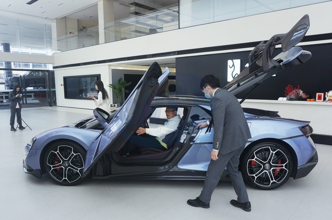 An agent serves a customer trying a Yangwang U9 electric supercar at a dealership in Hangzhou in east China's Zhejiang province Thursday, March 21, 2024. Yangwang Auto is the high-end brand of the Chinese EV maker BYD., Credit:LONG WEI / Avalon