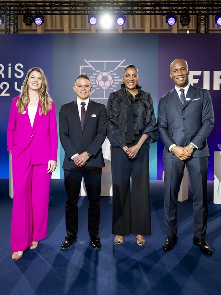 Stéphanie Labbé, Javier Saviola, Marie-José Pérec et Didier Drogba - Tirage final du tournoi olympique de football au siège de Paris 2014 le 20 mars 2024 à Saint-Denis le 20 mars 2024. © Pierre Perusseau/Bestimage Final draw for the Olympic football tournament at the Paris 2014 headquarters on March 20, 2024 in Saint-Denis