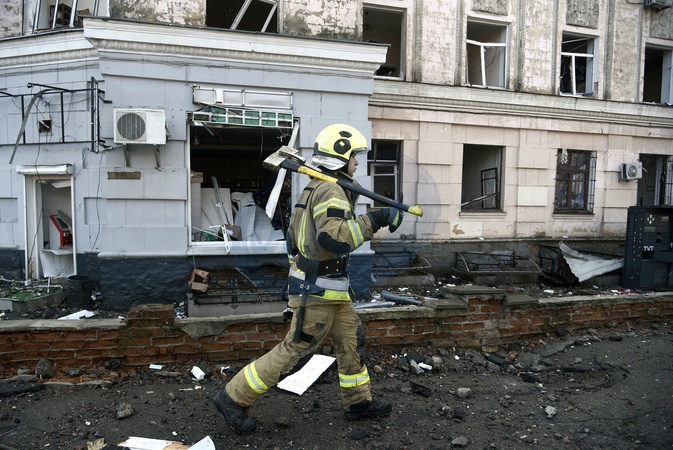 KYIV, UKRAINE - MARCH 21, 2024 - A firefighter eliminates the consequences of Russian shelling in Shevchenkivskyi district of Kyiv, capital of Ukraine., Credit:Ruslan Kaniuka / Avalon