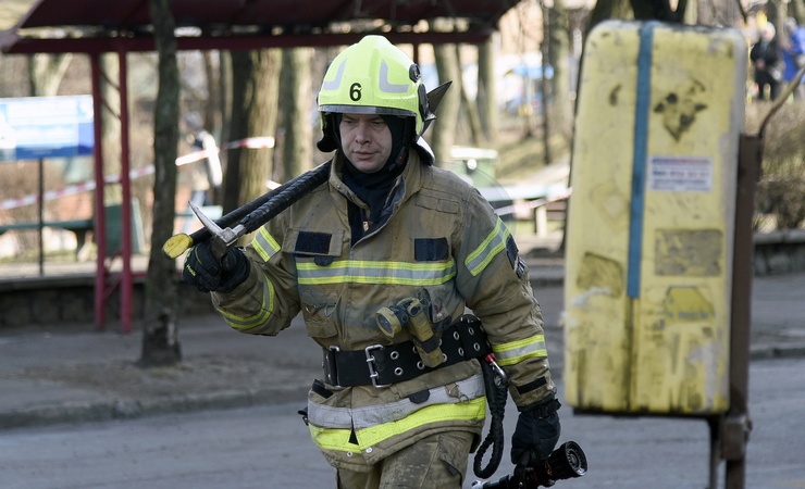 KYIV, UKRAINE - MARCH 21, 2024 - A firefighter eliminates the consequences of Russian shelling in Shevchenkivskyi district of Kyiv, capital of Ukraine., Credit:Ruslan Kaniuka / Avalon
