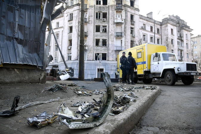 KYIV, UKRAINE - MARCH 21, 2024 - Fragments of a downed Russian shell are seen after a morning attack on Shevchenkivskyi district of Kyiv, capital of Ukraine., Credit:Ruslan Kaniuka / Avalon