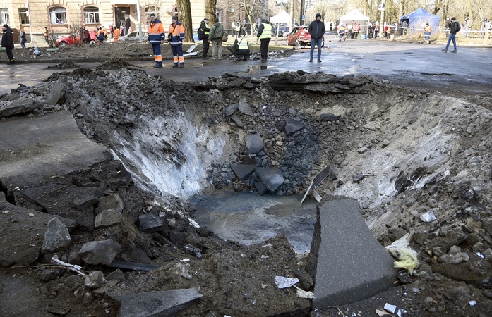 KYIV, UKRAINE - MARCH 21, 2024 - A shell crater is seen at the site of a Russian missile fall in Shevchenkivskyi district of Kyiv, capital of Ukraine., Credit:Ruslan Kaniuka / Avalon