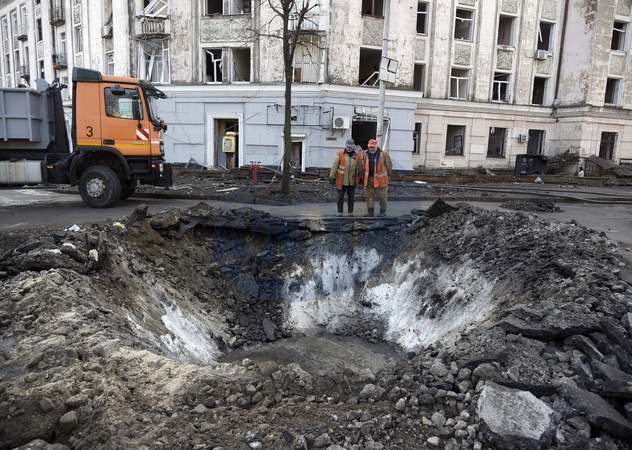 KYIV, UKRAINE - MARCH 21, 2024 - A shell crater is seen at the site of a Russian missile fall in Shevchenkivskyi district of Kyiv, capital of Ukraine., Credit:Ruslan Kaniuka / Avalon