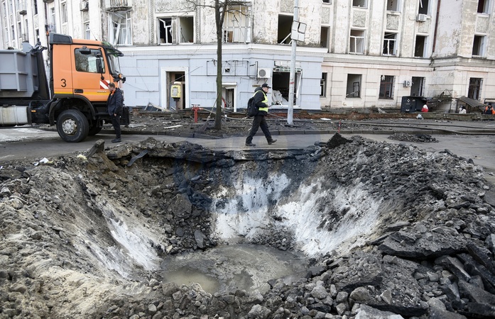 KYIV, UKRAINE - MARCH 21, 2024 - A shell crater is seen at the site of a Russian missile fall in Shevchenkivskyi district of Kyiv, capital of Ukraine., Credit:Ruslan Kaniuka / Avalon