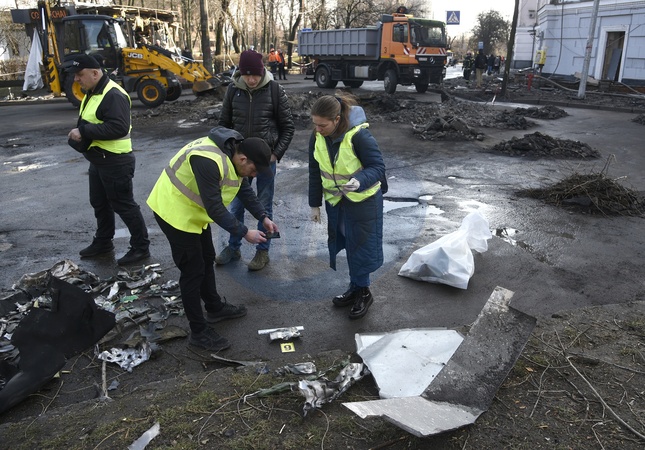 KYIV, UKRAINE - MARCH 21, 2024 - Experts collect the debris of a downed Russian missile that fell in Shevchenkivskyi district of Kyiv, capital of Ukraine., Credit:Ruslan Kaniuka / Avalon