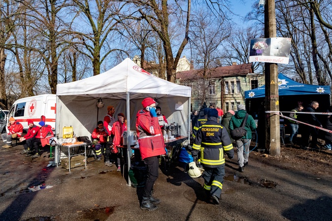 KYIV, UKRAINE - MARCH 21, 2024 -Coordination tents deployed by medics and police officers to help victims of a Russian missile strike on Shevchenkivskyi district of Kyiv, capital of Ukraine., Credit:Pavlo_Bagmut / Avalon